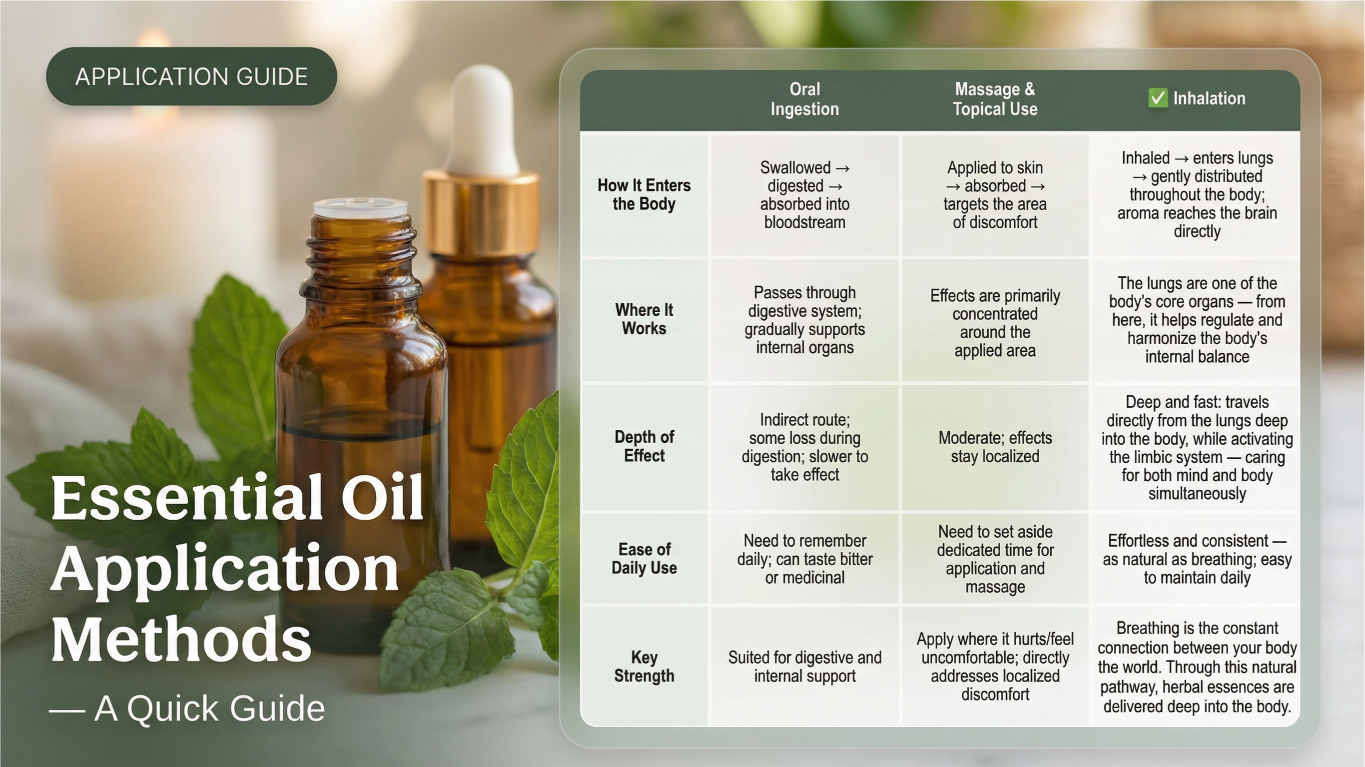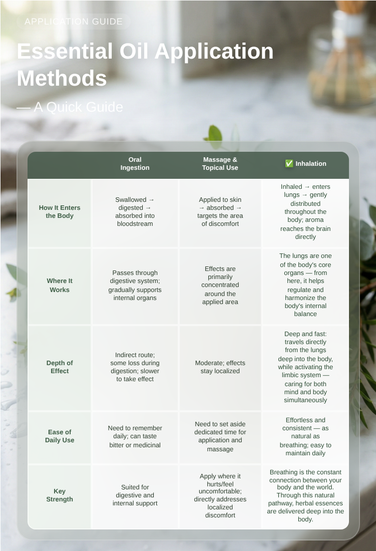 - Do not apply pure essential oil directly to skin — high concentration, must be used through diffusion.