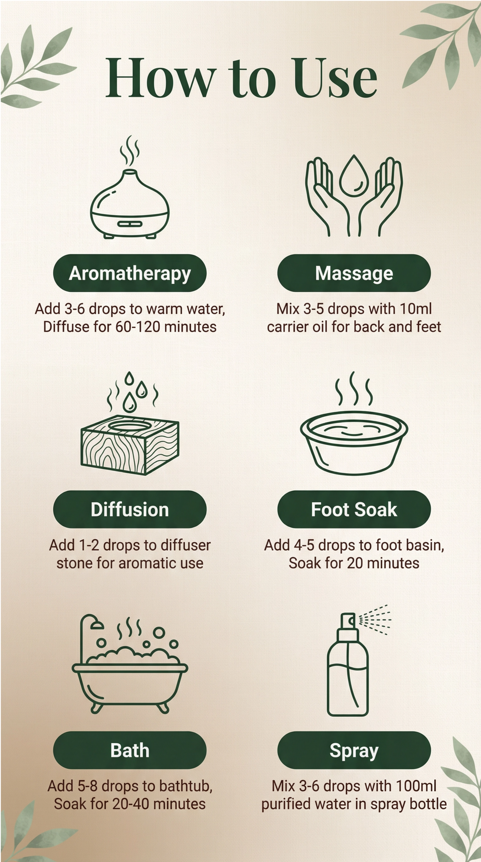 Aromatherapy, Massage, Diffusion, Foot Soak, Bath, Spay